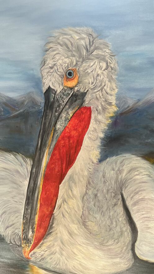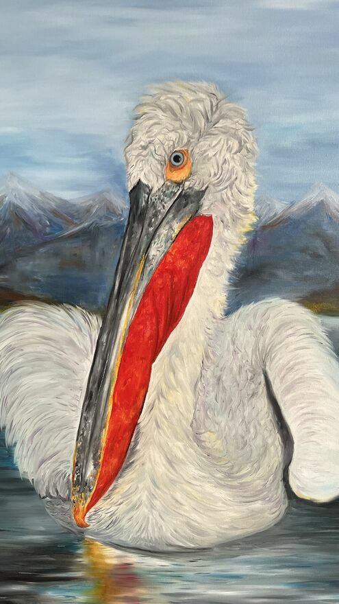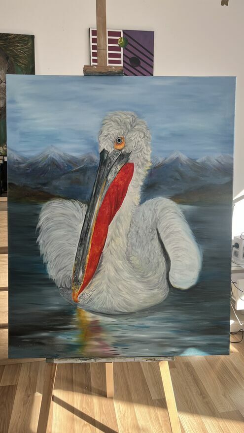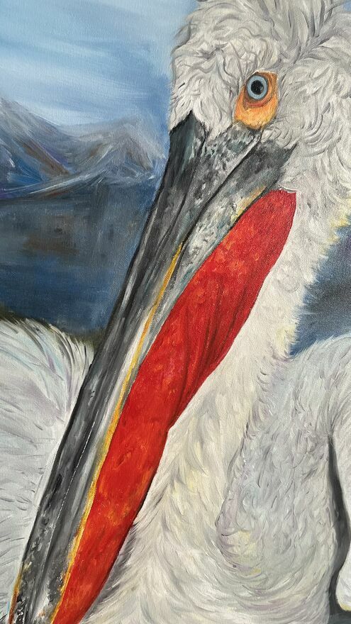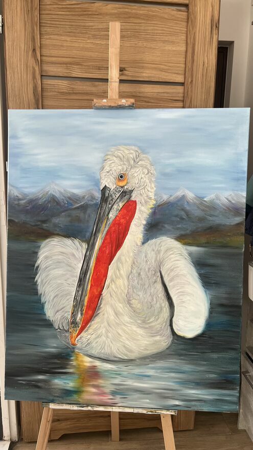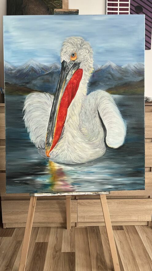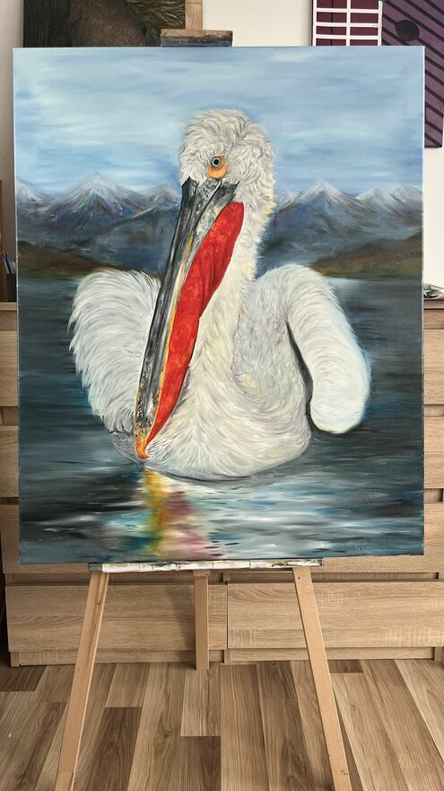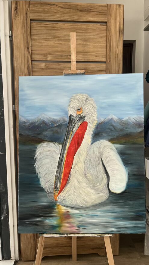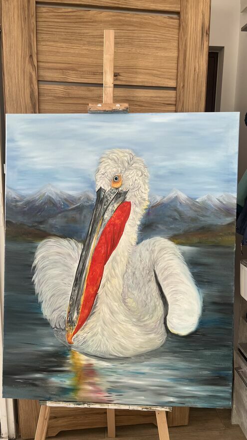 Sprzedam ręcznie malowany obraz olejny na płótnie przedstawiający kędzierzawego pelikana.Format: 100 × 80 cm.