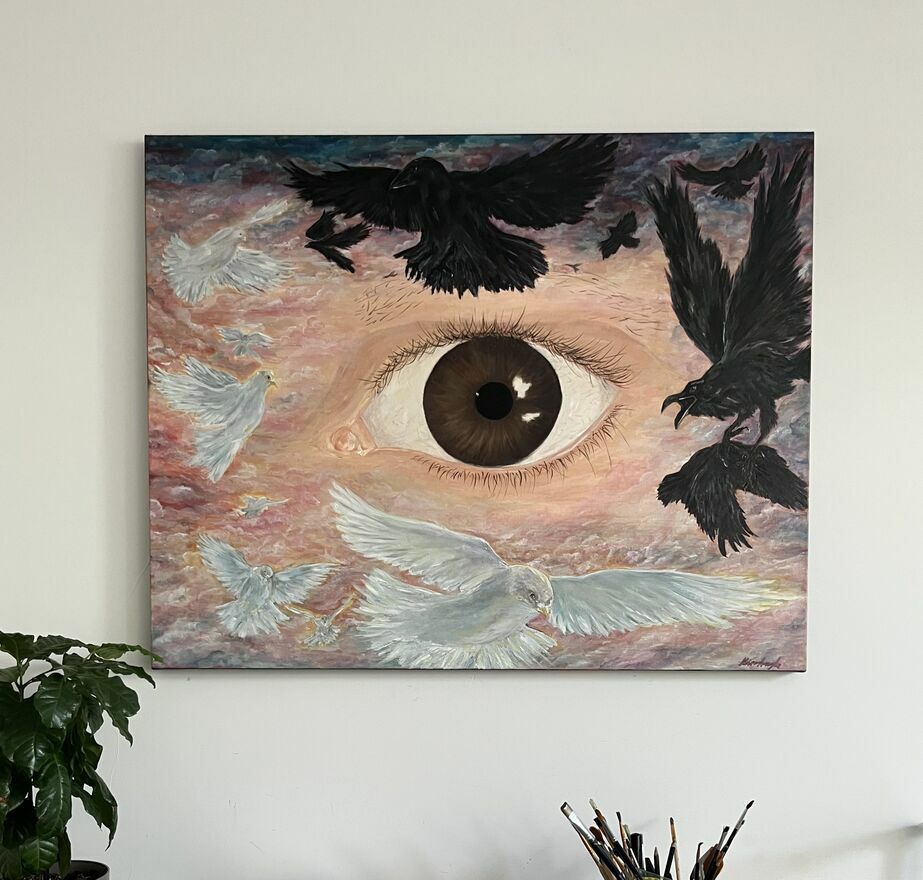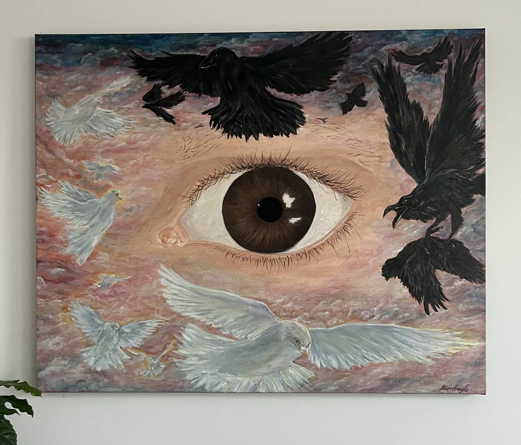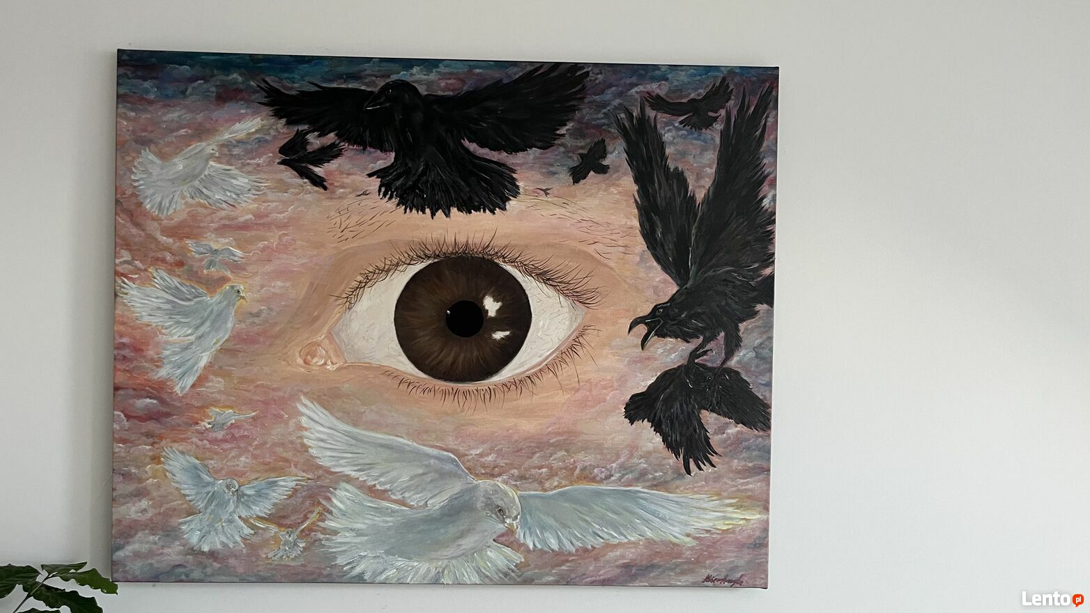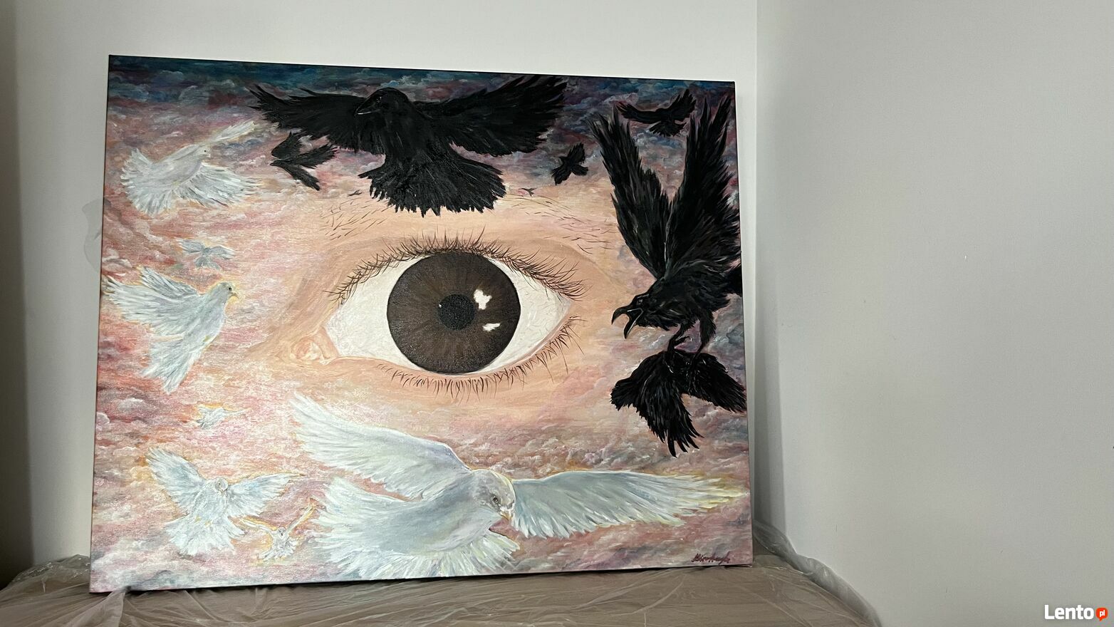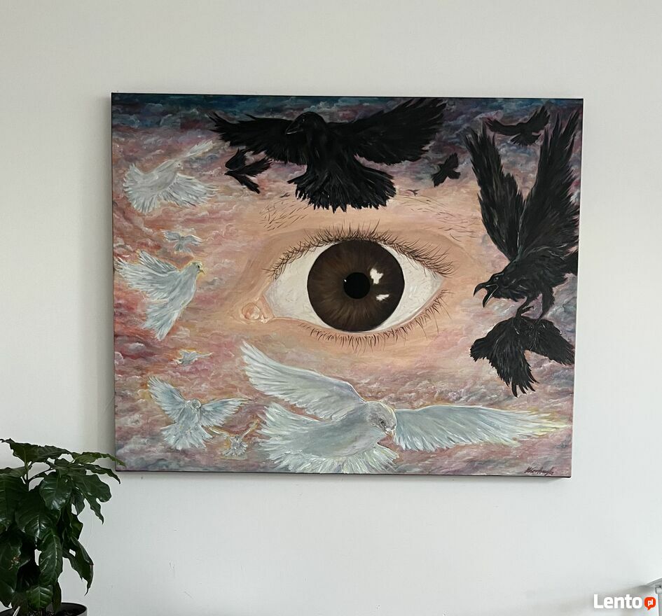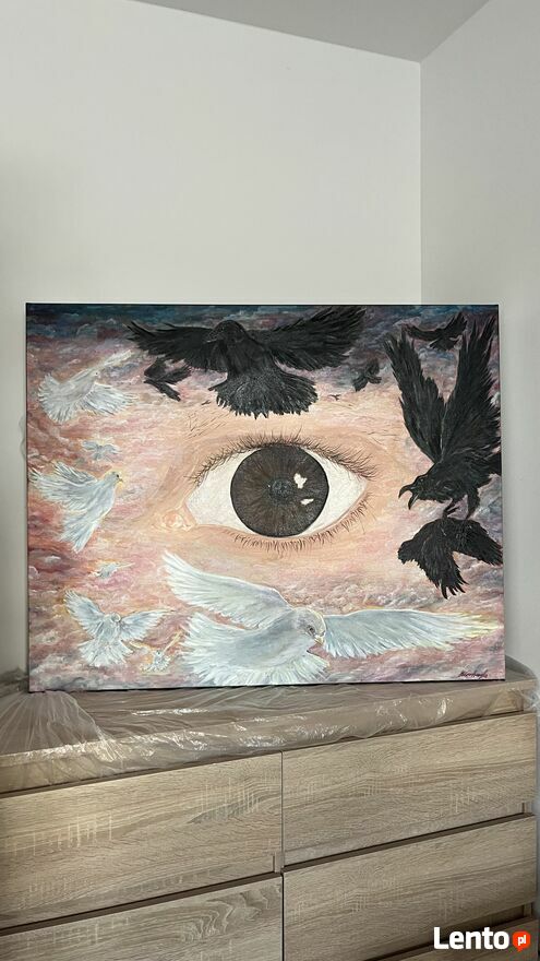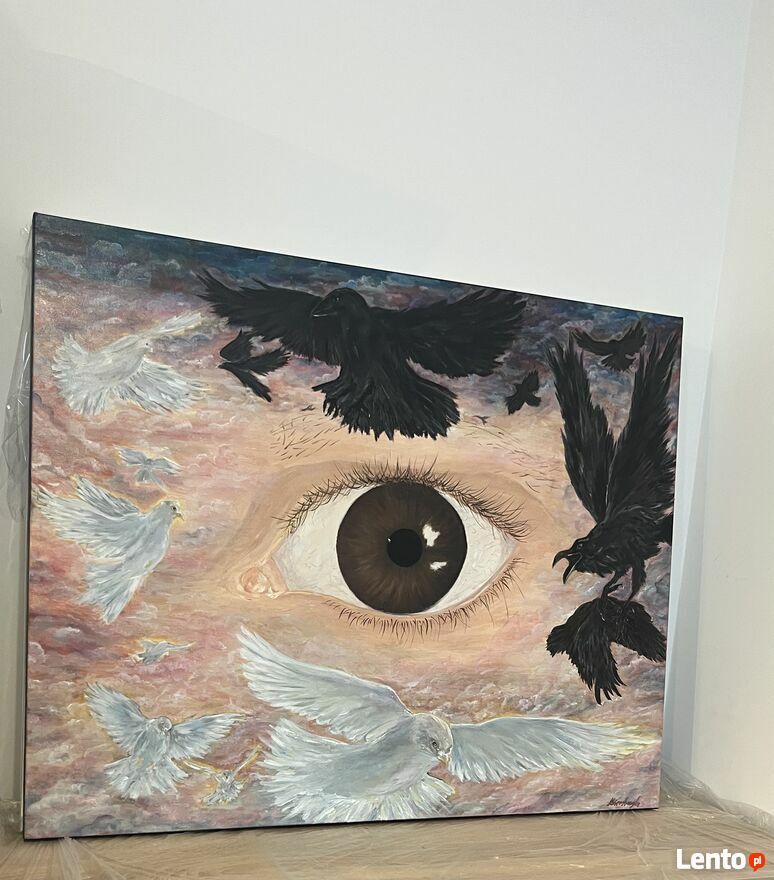 Ten obraz to zaproszenie do zatrzymania się na chwilę — do spojrzenia w głąb siebie. Centralne oko spogląda w ciszy, podczas gdy wokół niego wiruje światło i cień, gołębie i kruki — symbole nadziei i lęku, wolności i ograniczeń. To nie tylko dekoracja, lecz okno do wewnętrznego świata — do przestrzeni, w której każdy może odnaleźć własną historię, emocję, pytanie. Obraz został wykonany ręcznie farbami olejnymi na płótnie o wymiarach 100×80 cm, jest gotowy do powieszenia. Cena 1700 zł (możliwa negocjacja dla osoby, która naprawdę poczuje ten obraz) Nie patrz na obraz… pozwól, by on patrzył na Ciebie.Sprawdź zainteresowanie tym ogłoszeniem