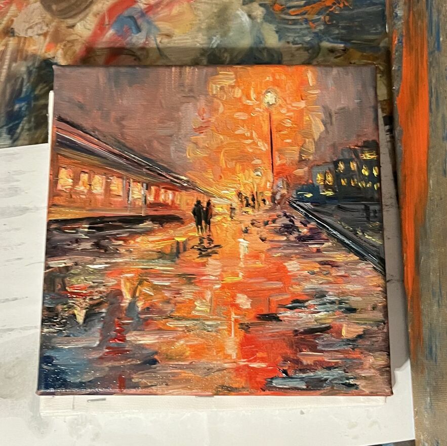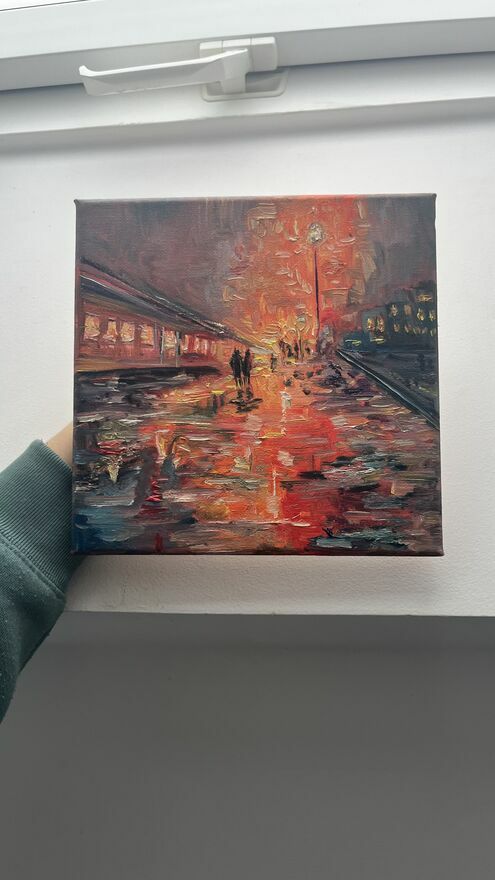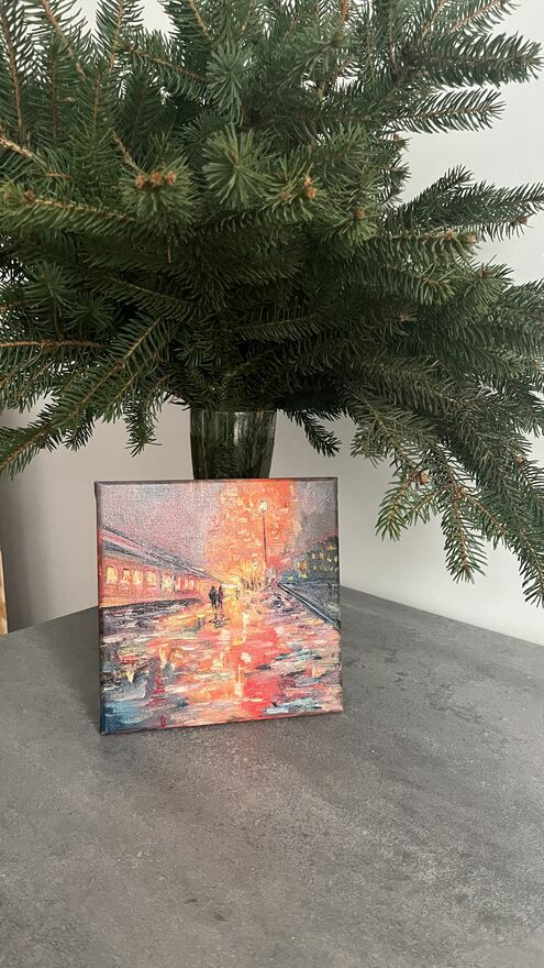 Mały, lecz niezwykle efektowny obraz olejny pełen koloru i energii. Mokre ulice odbijające światła miasta, para spacerujących ludzi — wszystko to tworzy dynamiczną, nowoczesną kompozycję. Idealny do nowoczesnych wnętrz, gabinetów, przedpokojów. Wyjątkowa praca w żywych barwach.Sprawdź zainteresowanie tym ogłoszeniem
