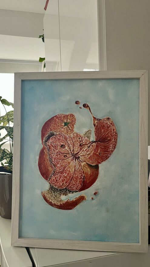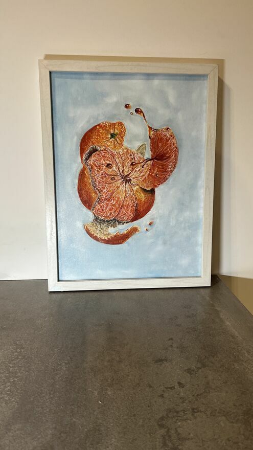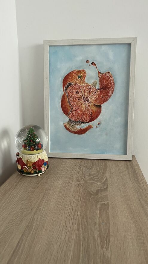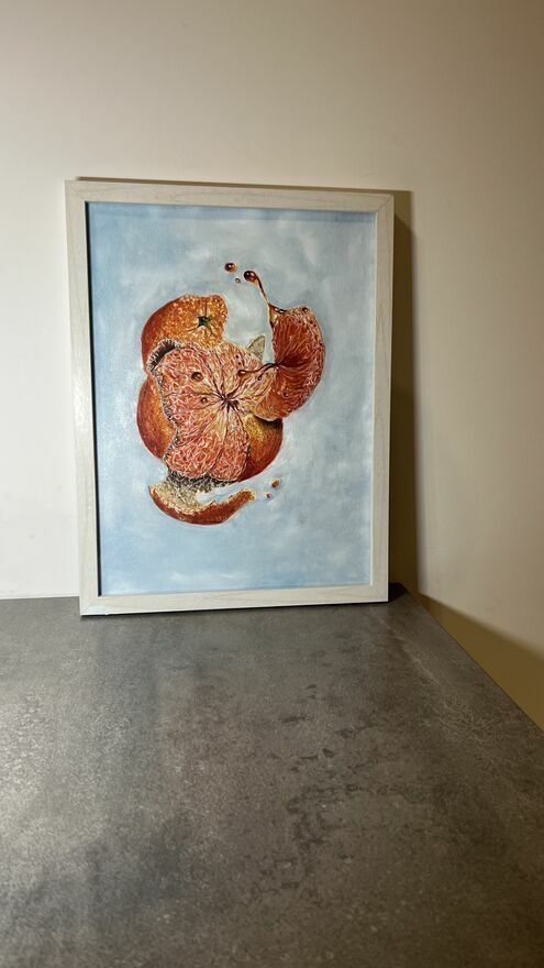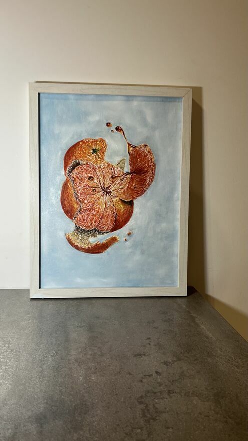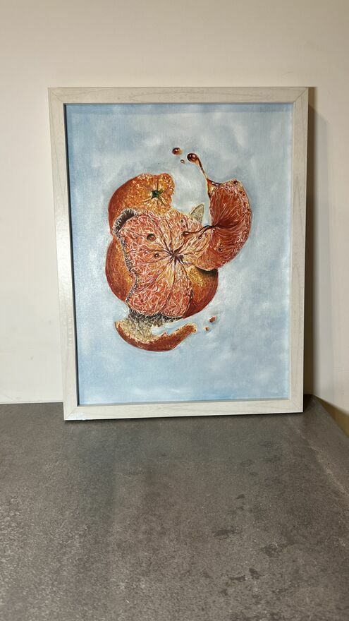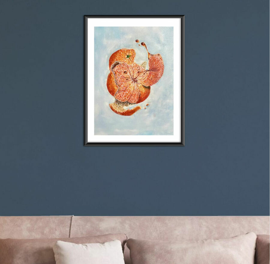 Dynamiczna i pełna życia kompozycja ukazująca moment eksplozji soczystości – pomarańcza zatrzymana w ruchu, pomiędzy realnością a gestem spontaniczności. Ciepłe, nasycone odcienie owocu kontrastują z chłodnym, subtelnym tłem, tworząc wrażenie świeżości i lekkości. Przenikające się refleksy światła i przejrzystość miąższu nadają obrazowi niemal zmysłowy charakter, a zarazem spokój i harmonię.To dzieło o energii, świetle i efemerycznym pięknie natury – idealne do nowoczesnych wnętrz, w których sztuka ma ożywiać przestrzeń i dodawać jej elegancji.