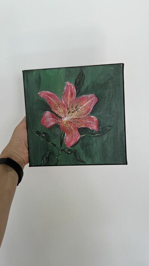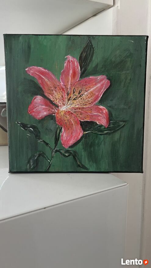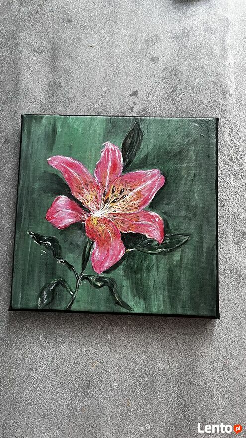 Subtelna, a jednocześnie pełna wyrazu.Na tym płótnie zakwitła lilia – symbol czystości, kobiecości i odrodzenia. Delikatny róż wprowadza nastrój spokoju i harmonii, a ręcznie malowana faktura nadaje pracy wyjątkowej energii.