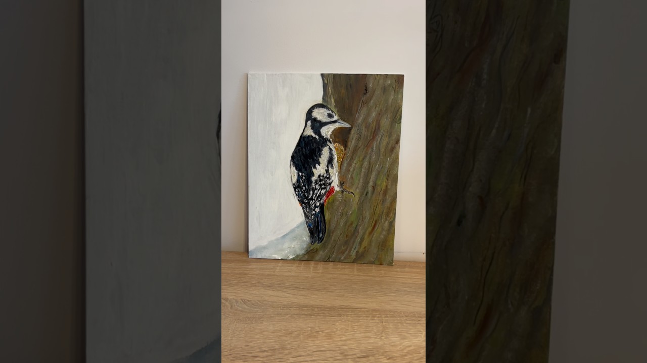 Ten obraz przedstawia dzięcioła siedzącego na pniu drzewa. Ptak jest uchwycony w spokojnym, naturalnym momencie. Jego kontrastowe czarno-białe pióra przyciągają wzrok od pierwszego spojrzenia.Minimalistyczne tło podkreśla sylwetkę ptaka i nadaje obrazowi nowoczesny charakter. Widoczne pociągnięcia pędzla dodają faktury i życia. To obraz, który wprowadza do wnętrza spokój, siłę natury i harmonię.