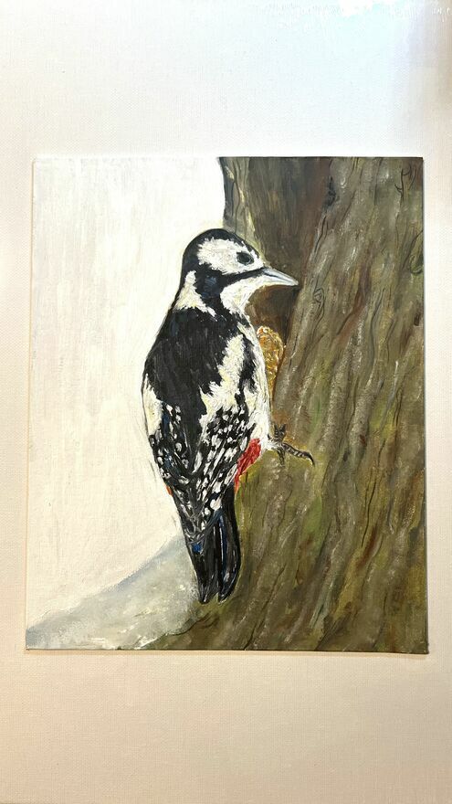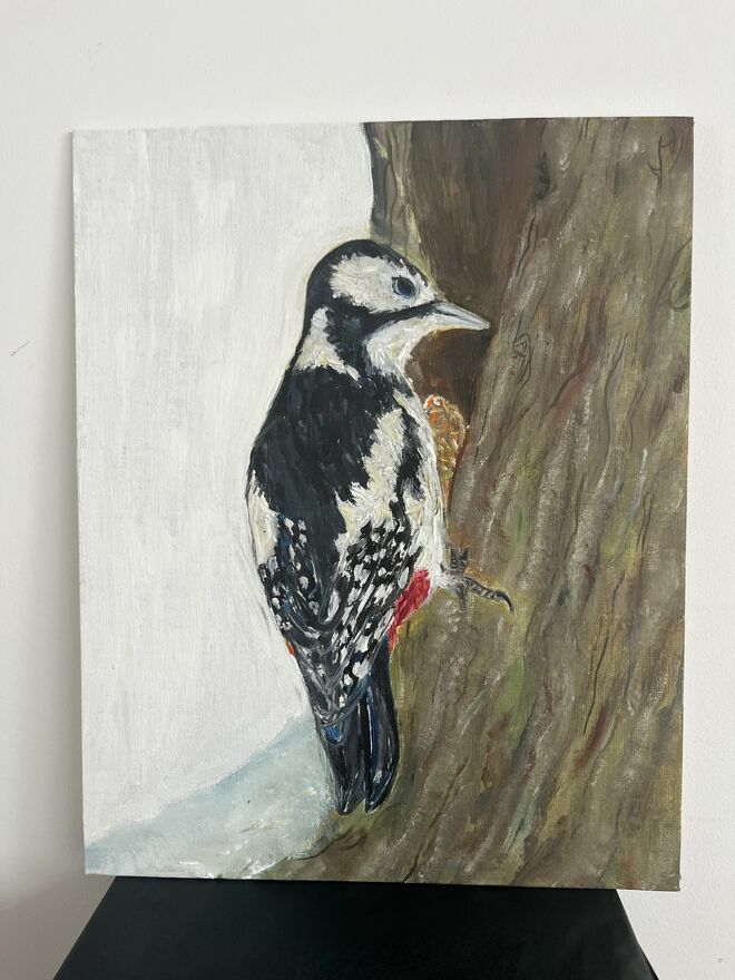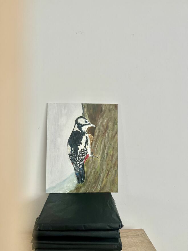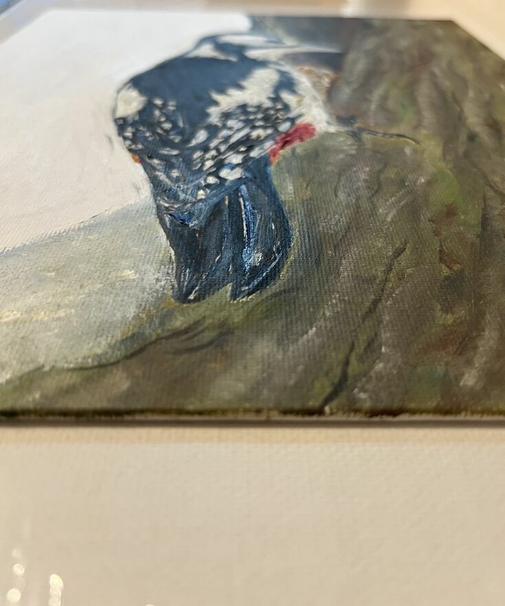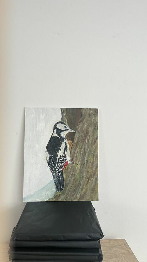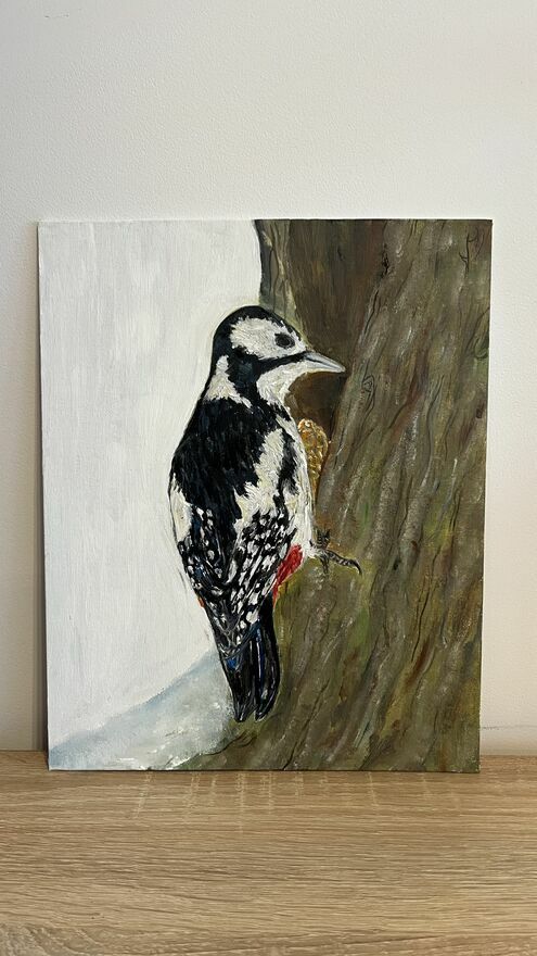 Strażnik lasu – dzięcioł, obraz olejny 24×30 ręcznie malo